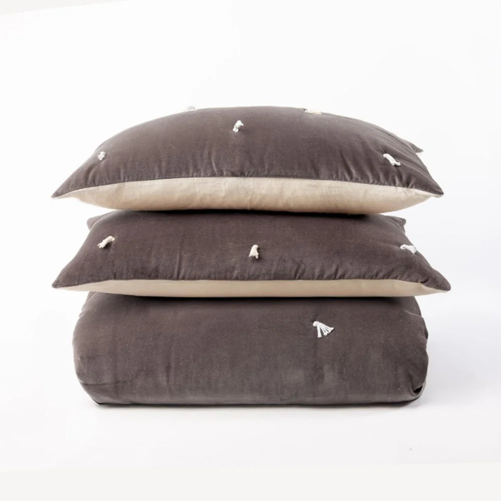 Snuggle into our Oakura. 100% cotton velvet front with natural cotton ties and reverse is natural in cotton/flax with a lofty filling. Gentle cold machine wash, no bleach. Do not tumble dry or dry clean. Made in India.
