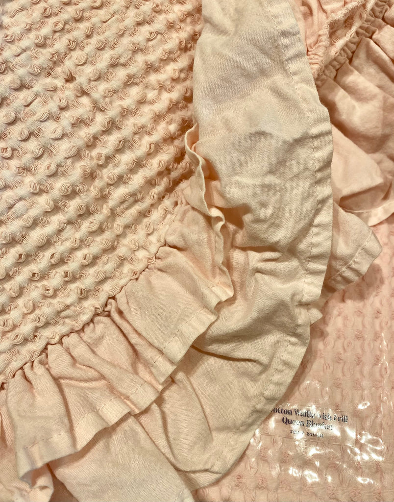 Our soft cotton waffle, with a frilled border detail - a little bit of whimsy - an added statement piece. This blanket is easy to layer and provides year round comfort. Made of 100% Cotton.